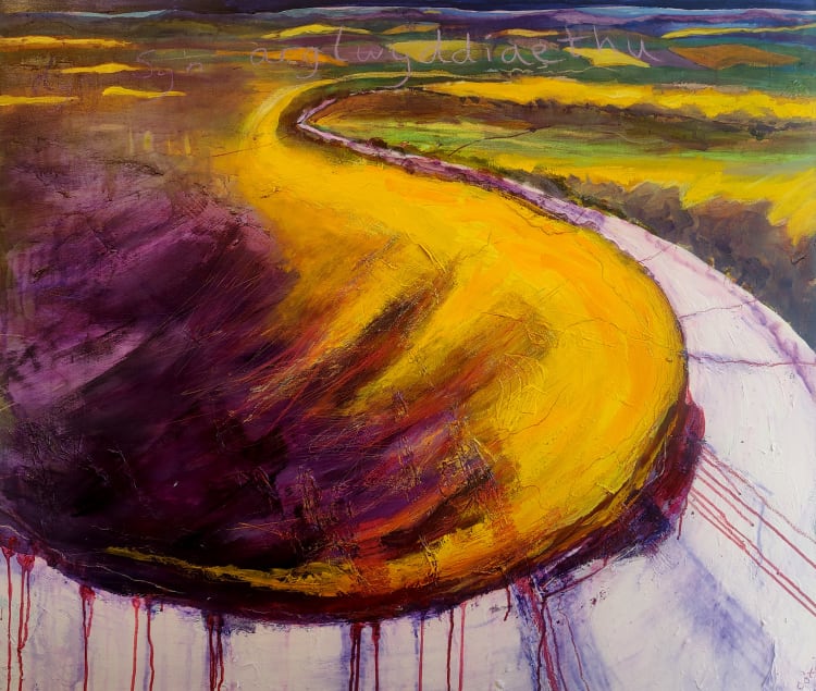 In her three large paintings on canvas, Cox uses iconic images of The River Wye, a river that, despite its beauty, is one of the most polluted in the UK. The River Wye catchment area is home to intensive poultry farming, which has led to significant environmental degradation. Cox's work sheds light on the hidden impact of industrial agriculture on the landscape, challenging viewers to reconsider their perceptions.