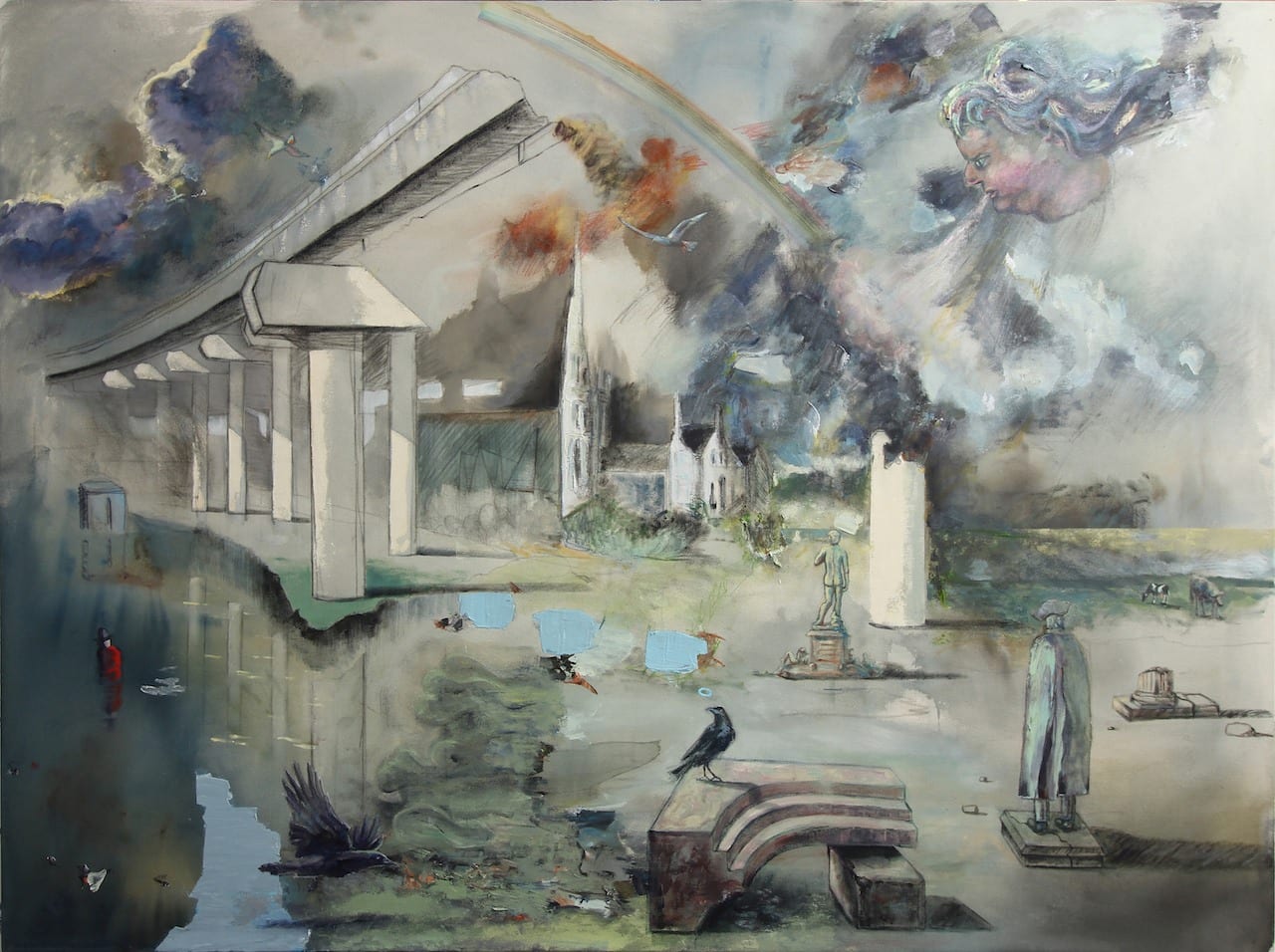 Black Rainbow is a powerful and poetic entry in Paul Newman’s English Gothic series, where romanticism and ruin converge in an atmosphere of eerie stillness and symbolic unrest. Painted with a muted, fog-washed palette and infused with theatrical surrealism, the composition unfolds across a dreamlike English landscape interrupted by a monumental overpass, a crumbling church, scattered statues, and a sky darkened by celestial drama.