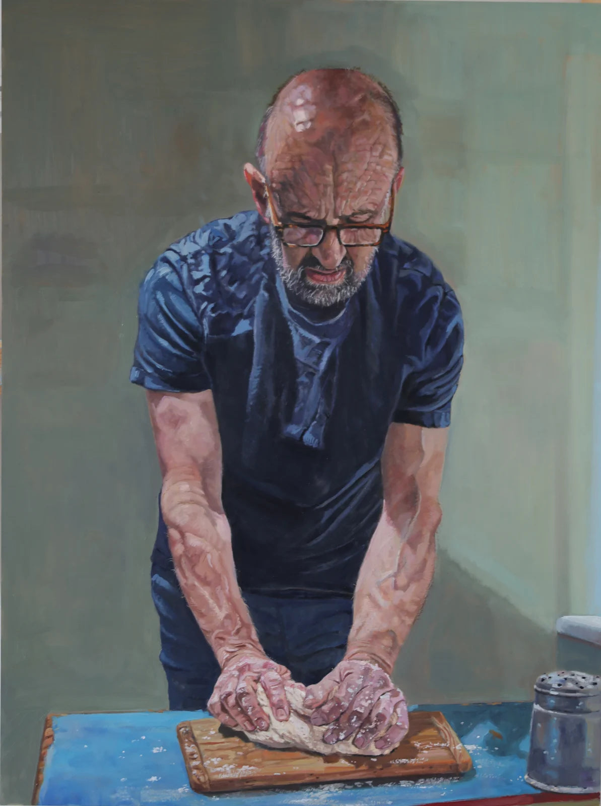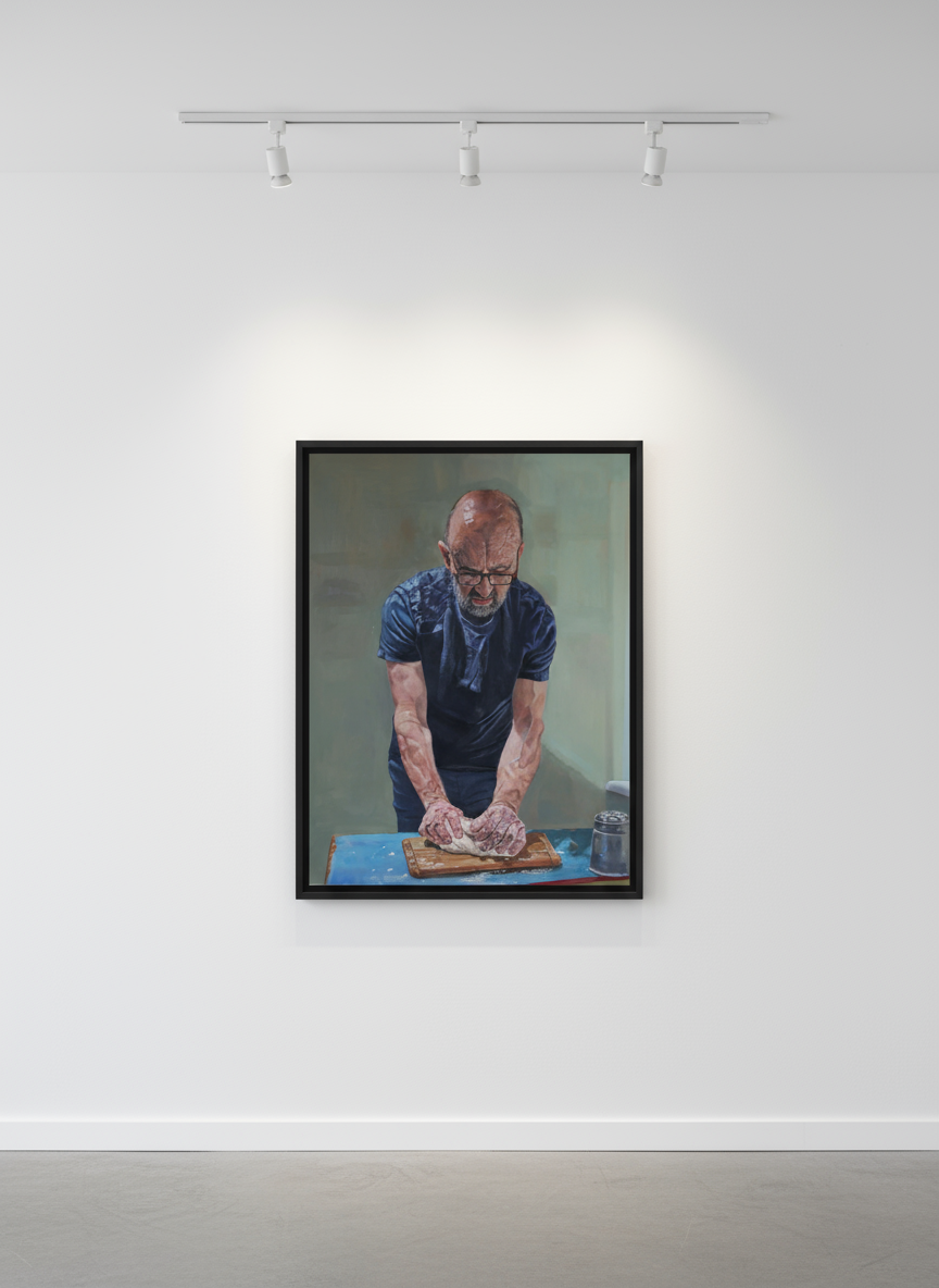 In Daily Bread, Howard Mason offers a meditative self-portrait that unites the physical act of kneading with spiritual reflection. The artist leans over a blue tabletop — a humble altar of daily ritual — his hands working the dough with a quiet intensity that evokes themes of creation, nourishment, and sharing. The composition carries a subtle Christian resonance, recalling the virgin's blue cloak the breaking of bread and the sanctity of labour. Like Giovanni Bellini’s early Renaissance devotional paintings, Mason employs the ledge as a device to both draw the viewer into the scene and also separate, bridging the space between art and witness. Through this intimate gesture, the painting becomes both a self-portrait and a contemporary act of contemplation — a moment where the sacred and the ordinary gently converge.